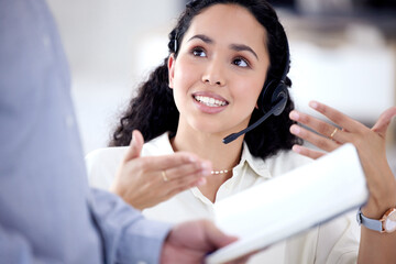 Sharing her input to find the best solution. Shot of a young call centre agent talking to a colleague in an office.