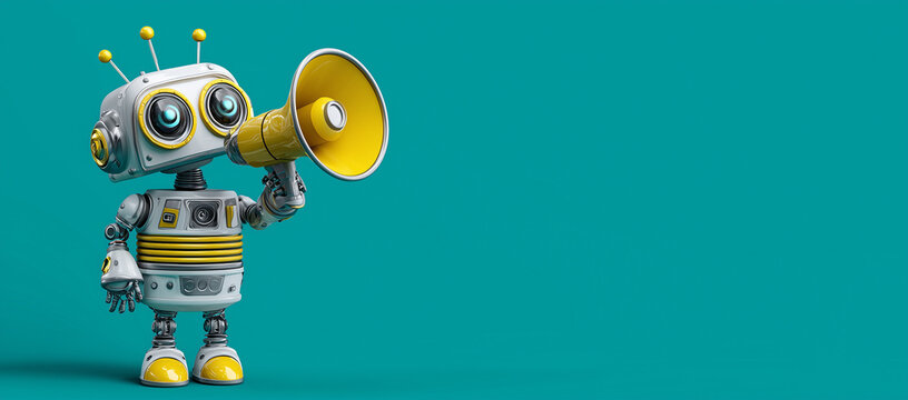 A futuristic AI robot agent uses a megaphone loudspeaker for broadcasting an announcement, advertising communication, and marketing with artificial intelligence and agentic autonomy