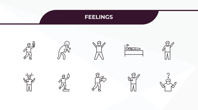 set of feeling and reaction thin line icons. feeling and reaction outline icons included inspired human, aggravated human vector.