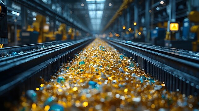 Golden and blue processed materials move along a conveyor belt in a vast modern industrial facility