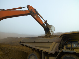Heavy Duty Dump Truck Unloading Crushed Rock at Construction Site.