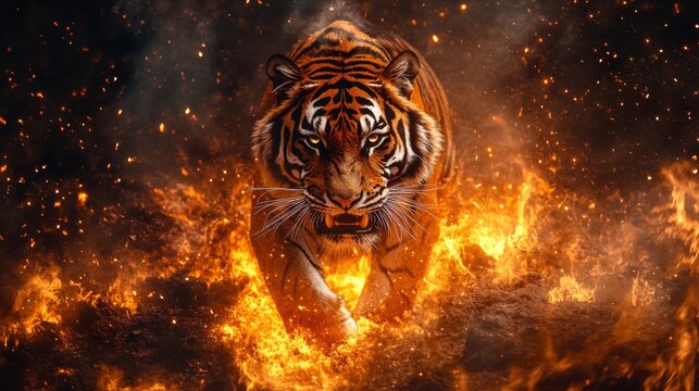 A fierce tiger with stripes glowing like molten lava emerges from a sea of flames, radiating power and intensity