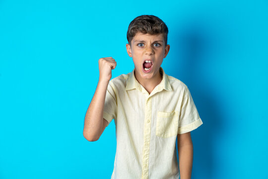 Beautiful kid boy wearing casual shirt angry and mad raising fist frustrated and furious while shouting with anger. Rage and aggressive concept.