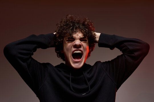 An angry young boy yells and clenches his fists, expressing strong negative emotions, frustration, and rebellion against a white background. Childhood tantrum concept