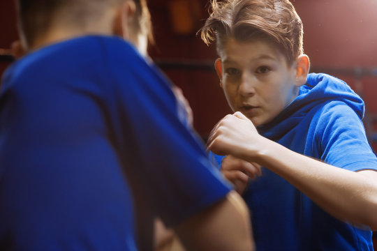 Two young  male boxers train in the ring for a fight