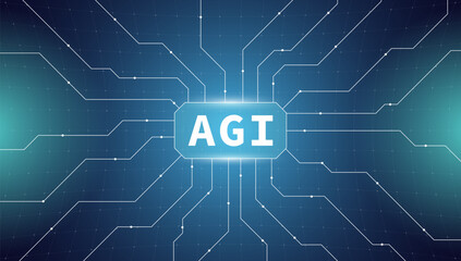 Artificial General Intelligence concept. Microchip with electric circuit board technology on blue background