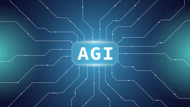 Artificial General Intelligence concept. Futuristic hallway with bright lights and AGI logo prominently displayed.