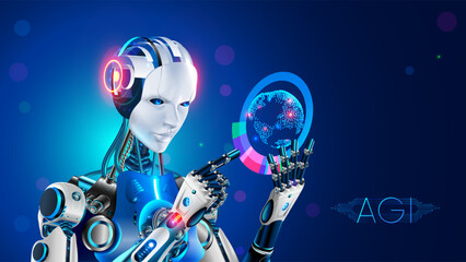 A robot or cyborg with AI holds a projection of the Earth in his hands. Artificial general intelligence or AGI logo. AGI takes care of the Earth. Humanoid AI robot with projection interface of Earth.