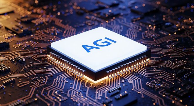 Futuristic depiction of artificial general intelligence agi on a computer microchip