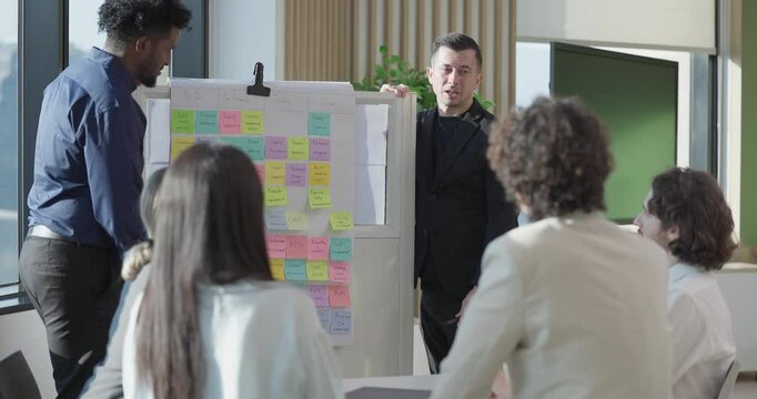 Business people, writing and planning on glass board for marketing timeline, calendar and presentation ideas in meeting. Professional manager or staff workflow, sticky notes and scrum or agile goals