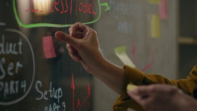 Glass, Management consultant tensely sticks a sticky note on a glass board in a meeting room. A cinematic follow-up shot of a skilled worker is at the workplace using modern technology, the company