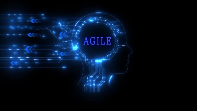 Futuristic neon glowing human head with agile text, digital circuits and data flow, artificial intelligence concept for HR technology, network technology concept.4k animation.
