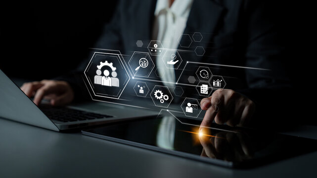 Human resources management software on computer screen helping human resources employee to manage recruitment, payroll, staff searching and KPI evaluation snugly