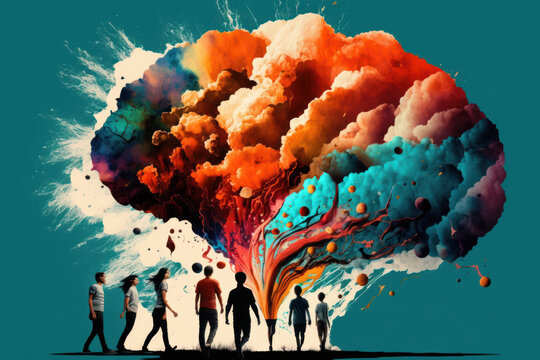 colorful human brain anatomy, colored mind scan, multicolored human mind model, left hemisphere, right brain hemisphere, variegated creative mind, brightly mindset, motley whimsical paint line art