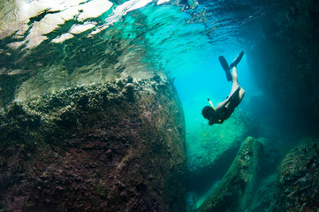 Female Diver with Reflection, Swimming in Cavern (Various Compositions)