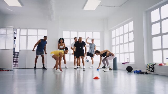 Diverse group of athletes running between cones, supporting and motivating each other during high-energy fitness training session in spacious, bright gym environment