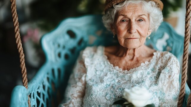 An elderly woman sits gracefully on a swing, radiating charm and wisdom with her soft expression and delicate lace attire, symbolizing beauty in aging and timeless elegance.