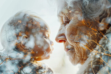 Half-aged face portrait showing young girl and elderly woman side by side, visual representation of aging process and passage of time, powerful concept of youth versus old age