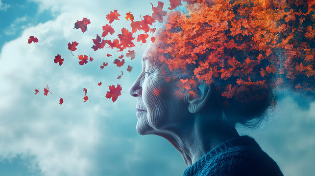 Dementia and Alzheimer concept. Illustration with woman and leaves flying from head