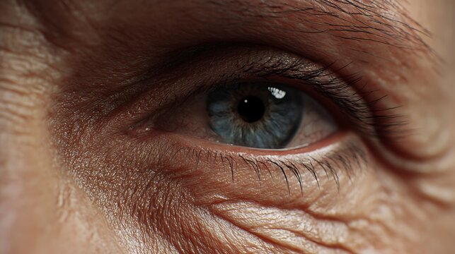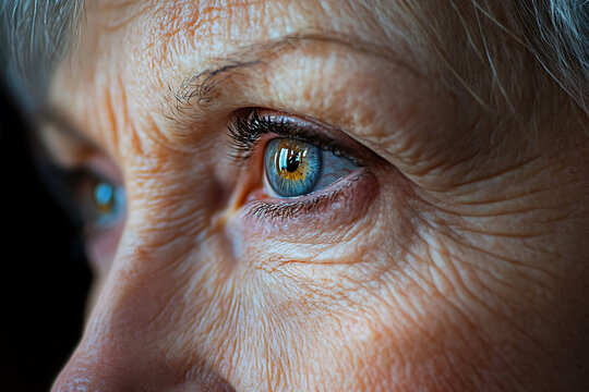 Macro photograph highlighting the wrinkles and expressive blue eyes of a senior woman, emphasizing the effects of aging on skin texture