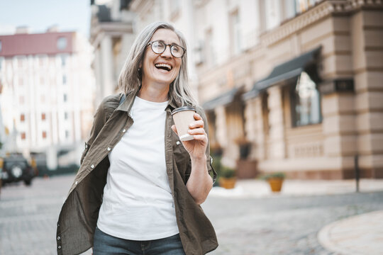 Concept of happy old age through image of silver-haired mature senior woman walking in city, enjoying cup of coffee. Woman is captured in moment of joy and contentment, with smile and positive mood.