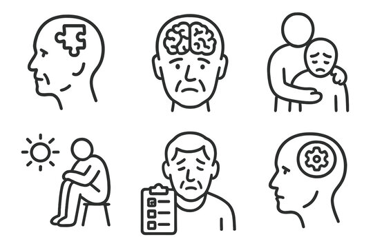 Aging Mental Health Icons. Line style icons of mental health in aging: memory loss symbol, dementia brain, emotional support