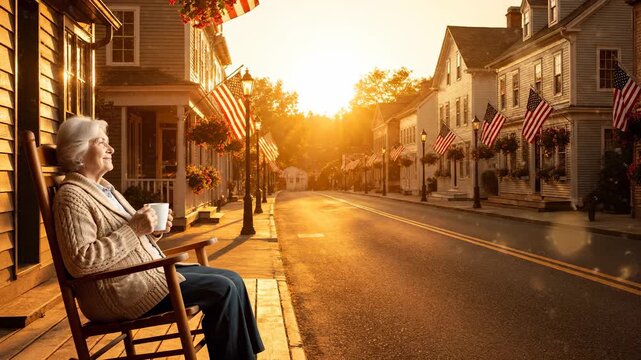 Elderly woman sitting porch drinking coffee at sunrise. Quiet town street lined with flag. Golden light emphasizes silence and relaxation. Gentle morning atmosphere invites peaceful reflection. Calm.