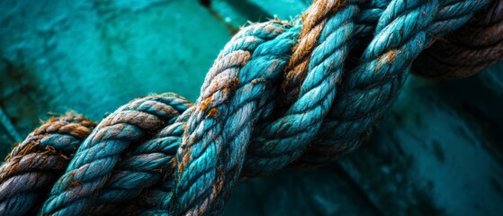 Thick, weathered rope coiled against a textured teal background, showcasing shades of blue and brown in an intricate, twisting pattern.