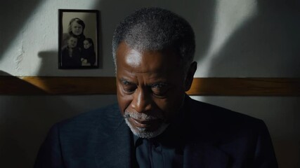Elderly man trying to remember family in old photo, showing symptoms of Alzheimer’s disease – conceptual footage for dementia awareness, memory loss, and mental health education initiatives.