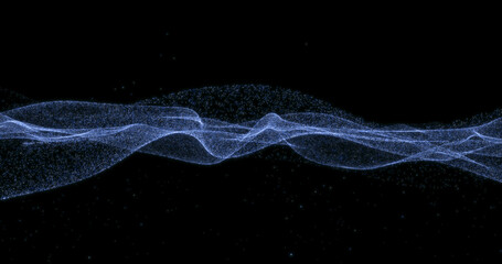 Agitated ocean of particles on black background. Cross-sectional surface of the sea. 3D render.