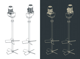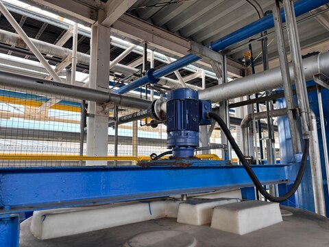 Top-down view of a blue industrial mixer motor and gearbox mounted on a processing tank in a chemical or manufacturing plant, surrounded by complex pipes and steel structures.