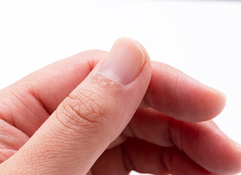 Dry and peeling skin under the fingernails, which may be caused by dry skin, dehydration, and a deficiency of nutritional vitamins or minerals. Isolated on white background