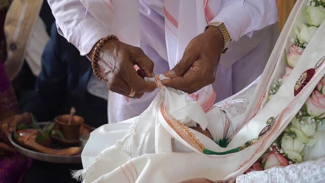 Hindu Wedding Ceremony Groom in Beige Sherwani with Priest Offering Prayers to Agni Divine Fire God in Studio Shot