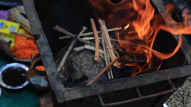 Divine Presence of Hindu God Agni Amidst Flames in Traditional Indian Setting