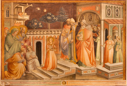 PRATO, ITALY - MARCH 15, 2025: The fresco of Presentation of Virgin Mary in Catedral  - Cattedrale di Santo Stefano by Agnolo Gaddi (1350-1396).
