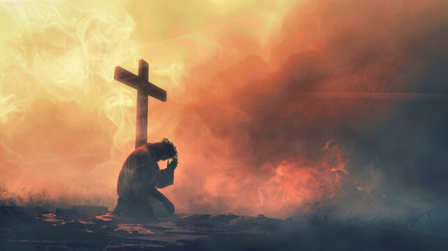 A silhouette of Jesus kneeling in prayer before a wooden cross, with a fiery sunset in the background