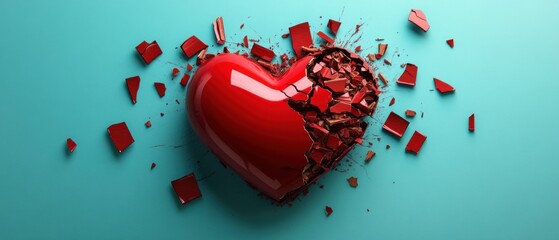Shattered red heart on teal background abstract love and loss concept