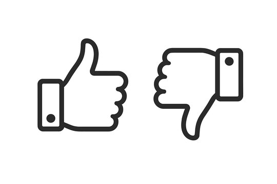 Thumbs up and thumbs down icon set. Like and dislike button concept. Vector hand gestures for positive and negative feedback. Approval, rejection, rating and review symbol.