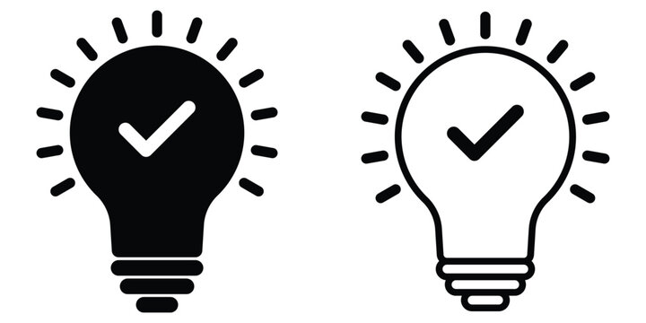 Light bulb with check mark icon set. Tick on black light bulb. Lightbulb check mark icon. Idea confirmation symbol. Vector graphic illustration.