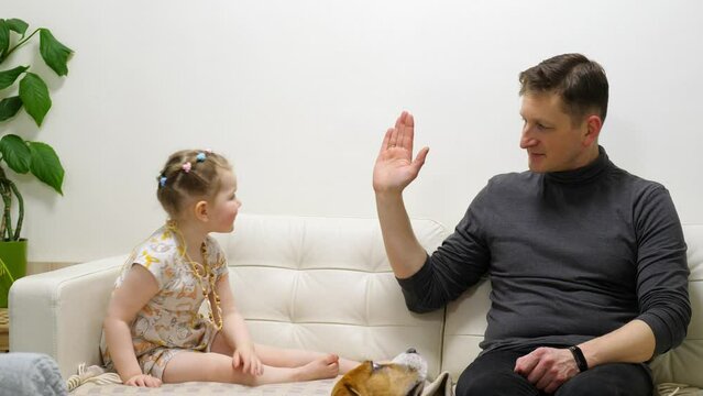 Father raise right hand and ask little daughter to give five, they slap hands and then repeat. Two people sit on sofa at living room, agreed or celebrate something, dog sit on the floor