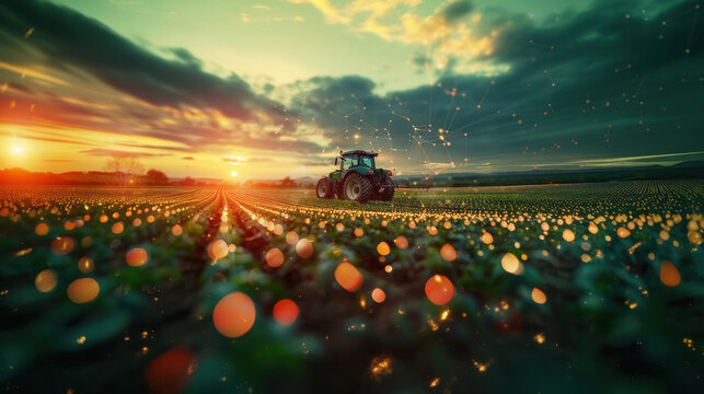 Smart farming concept with tractor and digital interface in field.
