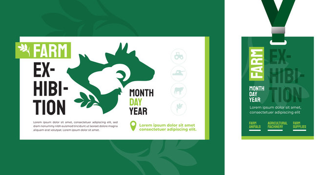 Design for farm exhibition, agriculture, livestock. Identity for agri business, agro conference. Illustration with sign of cow, pig, ram, chicken. Mockup ID card with strap. Template for flyer, print.