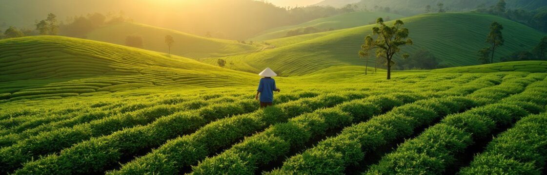 Person with conical hat walks through rich green tea rows on vast rolling hillside. Eco friendly tea garden stretches under golden sunlight, creating beautiful patterns. Serene agri landscape shows