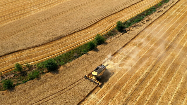 Combine harvester gathers the wheat crop. Wheat harvesting shears. Combines in the field Food industry concept.