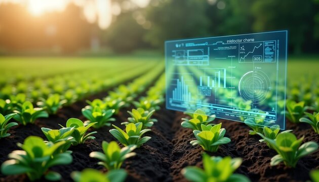 Young plants grow in field. Futuristic holographic interface displays data about growth, analysis. Modern tech monitors plant development. Smart agri tech supports eco-friendly farming. Automated