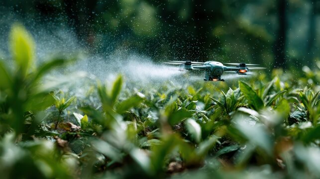 Low-flying agricultural drone spraying water or pesticide over lush green crop field in forested environment, representing smart farming technology, precision agriculture, sustainable crop management