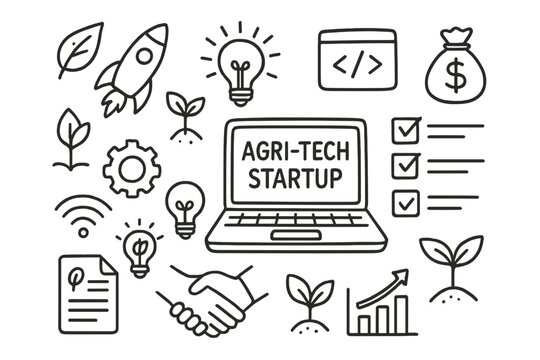 Agri-Tech Startup Icons. Hand-drawn doodle illustration Agri-tech startup laptop, rocket icon, idea bulb, code screen, money bag, leaf, sprout, gear,