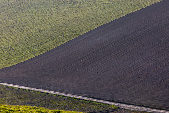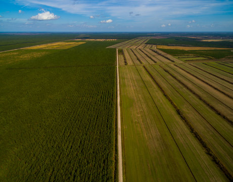 Aerial View of a Dirt Road Bisecting Agricultual Fields Stretching to the Horizon
