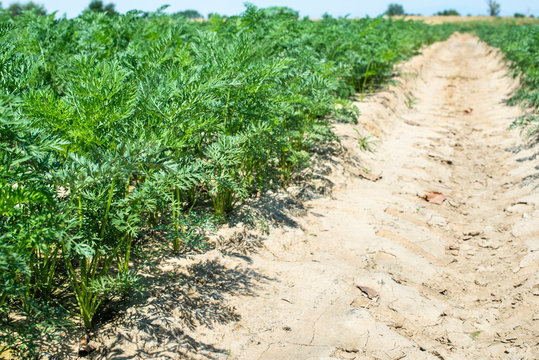 Carrots in big farmland. Irrigation hoses in carrot plantation.