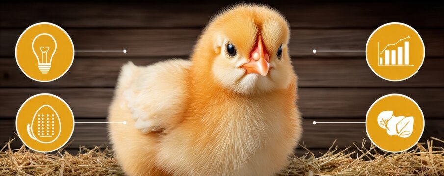 Chick with smart farm icons floating above in straw nest, representing modern agricultural technology